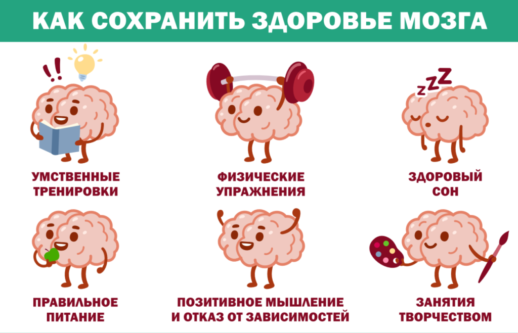 Для сохранения здоровья мозга важно сохранять высокий уровень физической и умственной активности, следить за артериальным давлением и своевременно проходить диспансеризацию и профилактические осмотры.